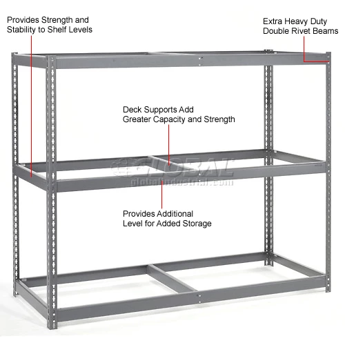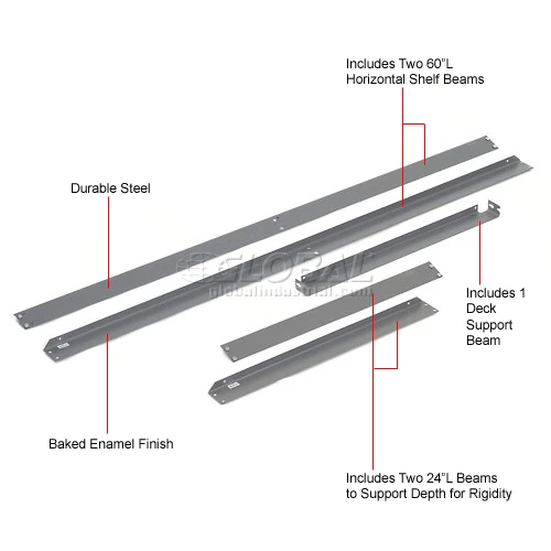 Beams fit 60″W decking and have a 1200 lb. capacity. Also includes 1 center deck support. (Supply your own decking.) Boltless assembly with snap together components requires no nuts, bolts, clips or tools.