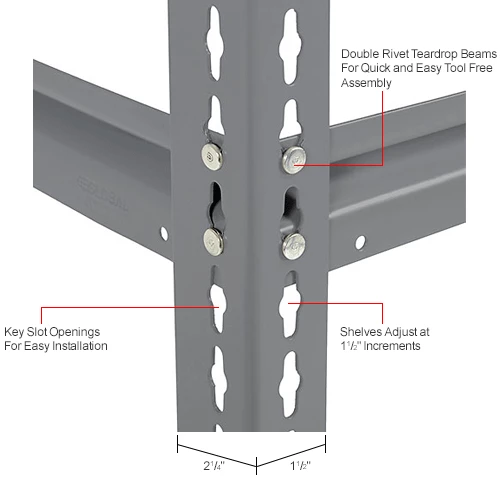 Horizontal beams are roll-formed to a Z-profile for added shelf capacity. Decking sits flush to beams for neater appearance and stability. 2-1/4″ x 1-1/2″ x 14-gauge uprights. Boltless, interlocking beams with double teardrop postholes assemble quickly and without tools. Levels adjust at 1-1/2″ increments. Includes rugged wire grid decking that allows visibility and light, air and sprinkler penetration (reducing insurance premiums). gray baked enamel finish.