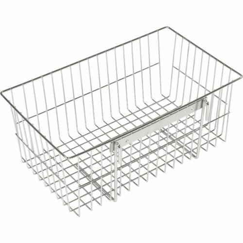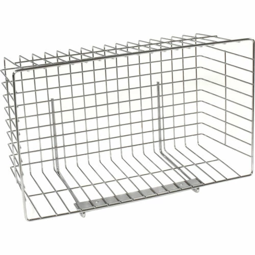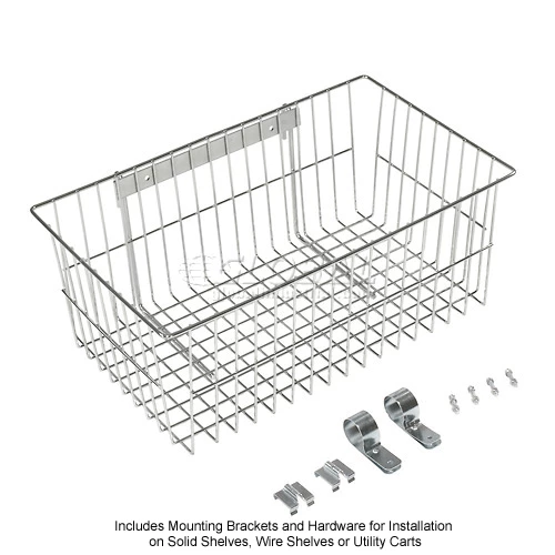 Provides additional storage or display for your wire shelving unit or Wall Wire Grid Panel. Heavy duty welded wire construction makes this an extremely durable basket to use for all types of products. Chrome over nickel electro plating creates a brilliant high gloss finish. Easy assembly. Limited One Year Warranty in dry application and usage. NSF approved dry use.