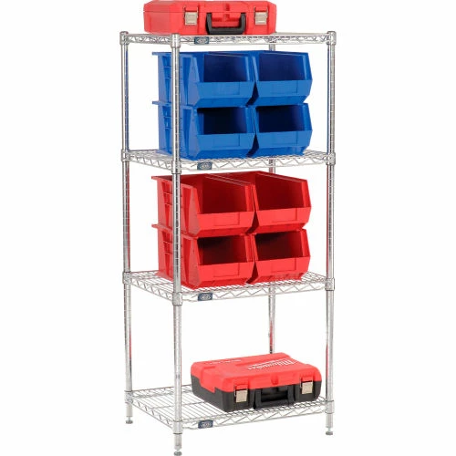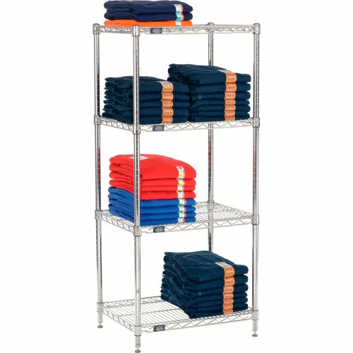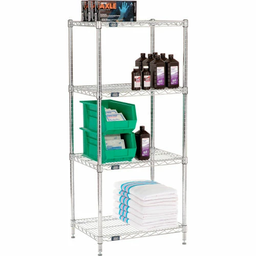 Chrome Starter Units are versatile enough for retail display, but withstand warehouse conditions as well. Starter Unit includes 4 posts with leveling feet, 4 wire shelves and plastic snap on sleeves to secure shelves to posts.