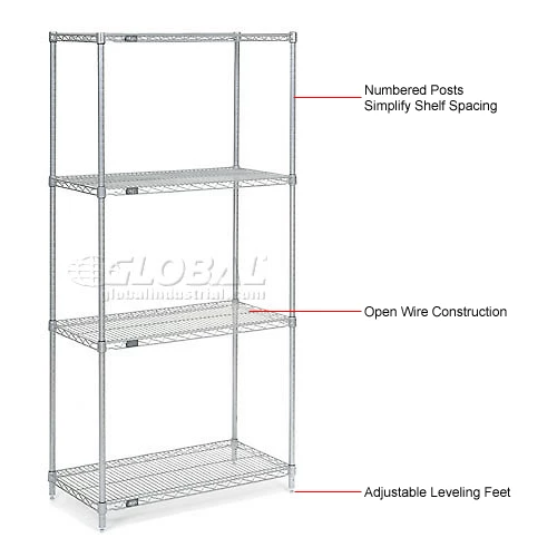 Nexel® Chrome, 4 Tier, Wire Shelving Starter Unit, 36"W x 14"D x 86"H