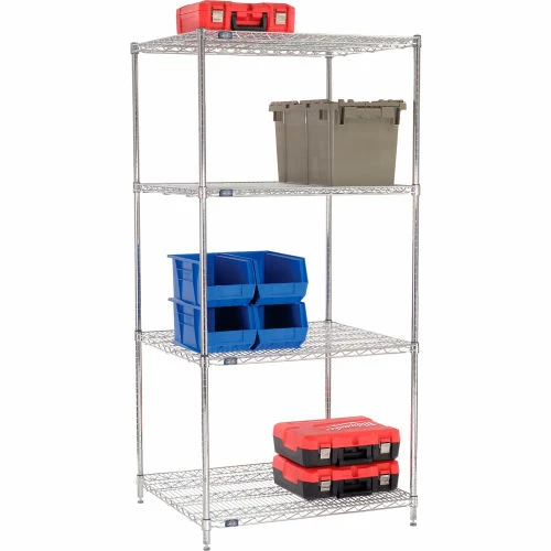 Chrome Starter Units are versatile enough for retail display, but withstand warehouse conditions as well. Starter Unit includes 4 posts with leveling feet, 4 wire shelves and plastic snap on sleeves to secure shelves to posts.