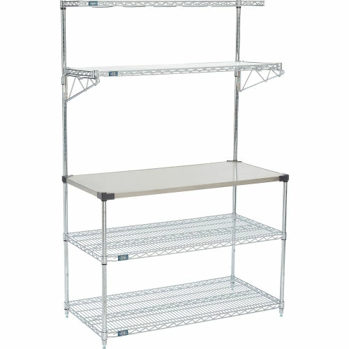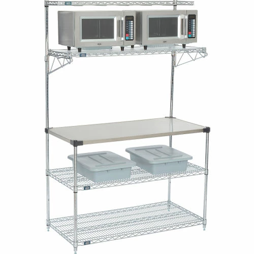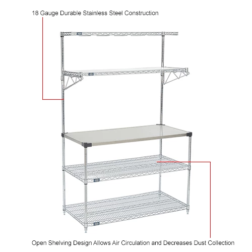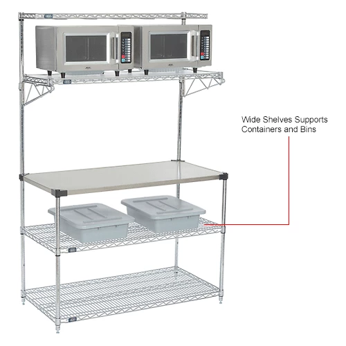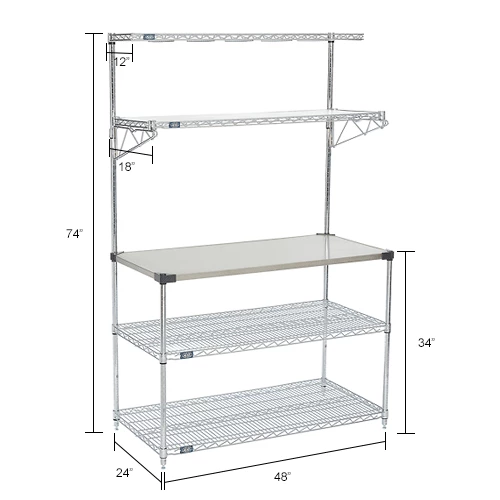 This food prep station provides a convenient and storage accessible work surface for multiple food service environments including kitchens, delicatessens, cafeterias, and more. The 18 gauge type 304 stainless steel tabletop ensures various content support while preventing rust and oxidation in wet or moist conditions. Flexible wire design allows easy area customization and display of dry ingredients, canned goods, utensils, and more. Workstation includes adjustable overhead and undershelf wire shelves for easily accessible and out of the way storage. Finish is Chrome. Dimensions are 48″W x 24″D.
