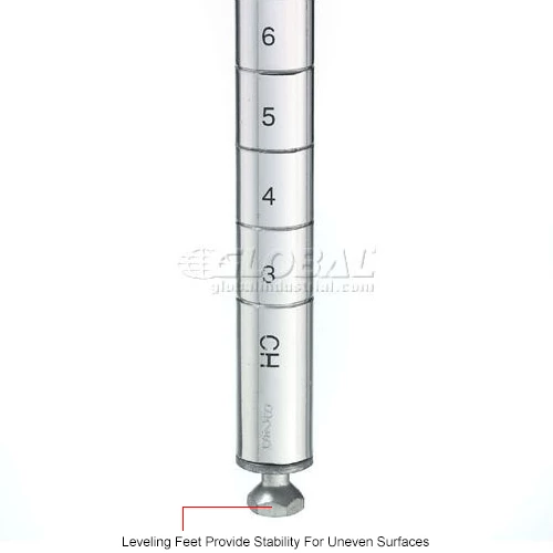 Build or add on to your shelving with additional posts that make for limitless configurations. Numbered marks make shelf leveling easy and fast at 1″ increments. Includes factory installed floor levelers and plastic top caps. Chrome plated finish is attractive enough for retail display, but withstands warehouse conditions as well. NSF approved. Limited one year warranty in dry application and usage. Set of 2.