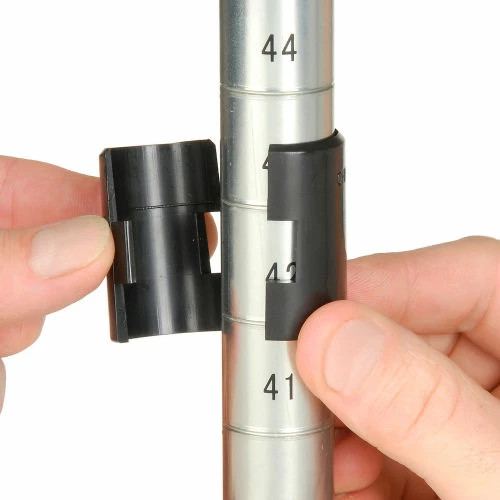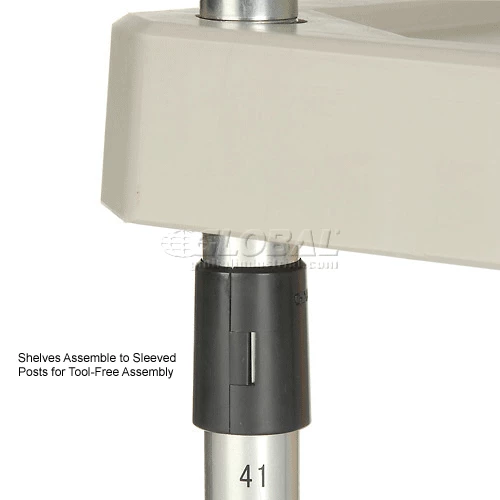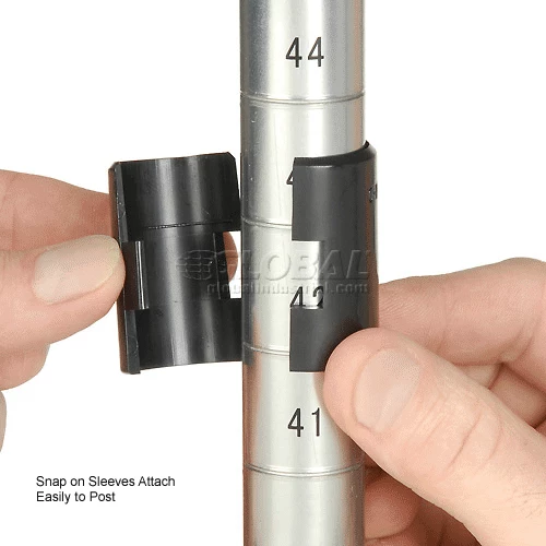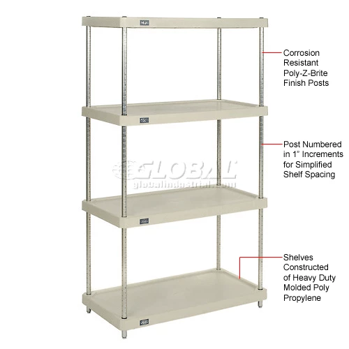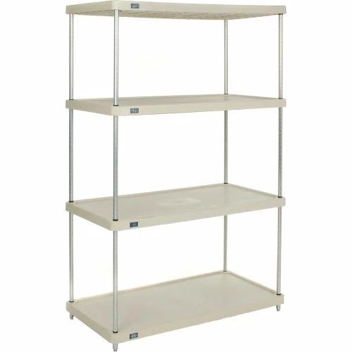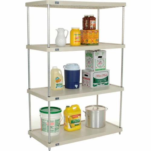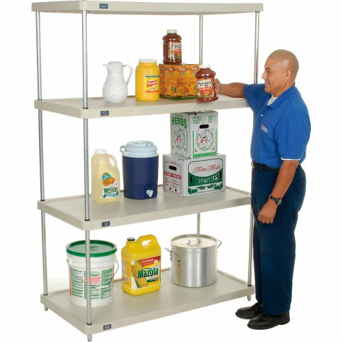 These shelf units are ideal for dry storage, freezers, and coolers. NEXGardÂź an anti-microbial agent protects the epoxy coating from bacteria, mold, and mildew that causes odors and product degradation. 4-shelf units feature solid plastic shelves supported by sturdy steel frames and posts. Plastic Shelves include a raised edge to prevent spills and adjust at 1″ increments (with snap-on plastic sleeves, included) on numbered posts for accurate alignment. Includes 4 upright posts and 4 shelves. Easy tool free assembly.